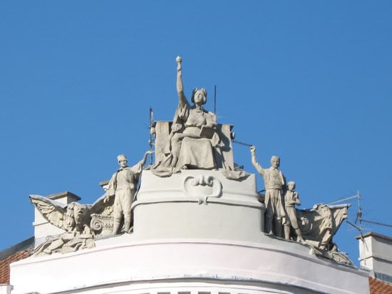 Јављају се класицистички декоративно- конструктивни елементи стубова са стилизованим капителима и конзоле у виду волута, као и симболи Аустроугарске Монархије, царске круне и ликови.